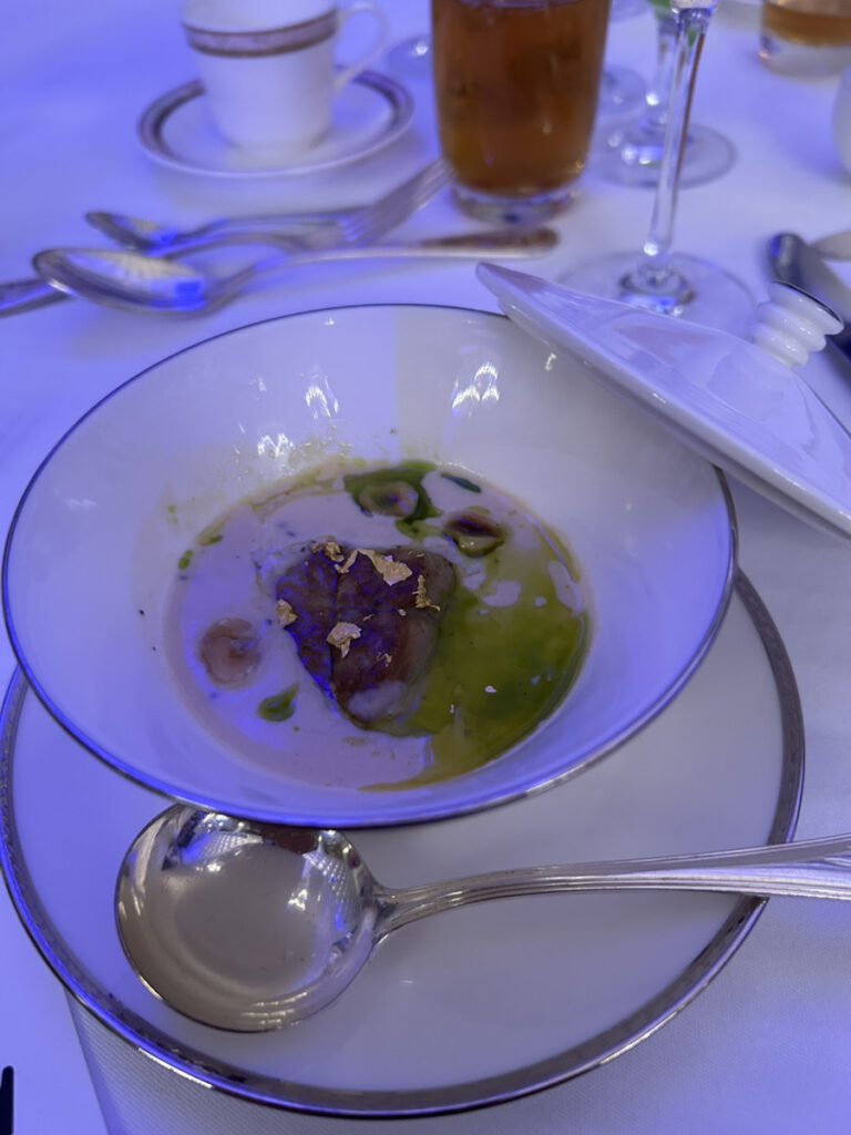 このポタージュ最高に美味しかった『コンソメロワイヤルと根セロリのポタージュ フォアグラとヘーゼルナッツ』