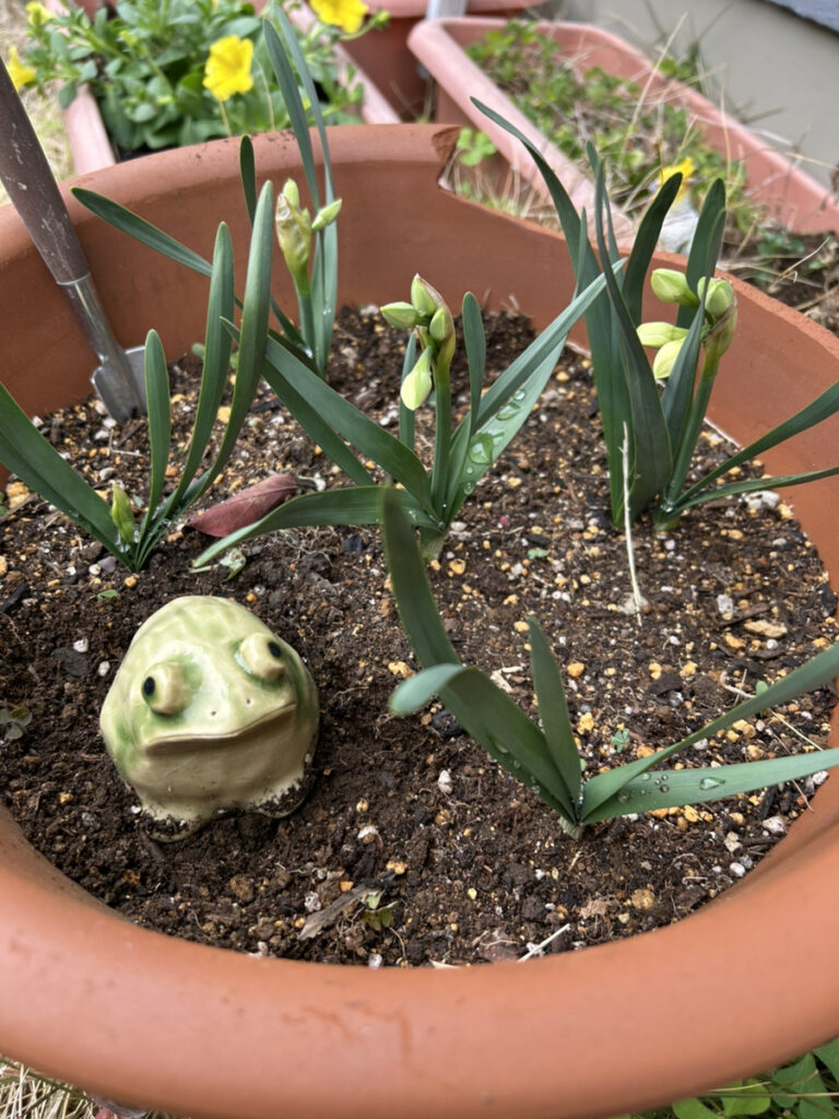 カエルくんも咲くのが待ち遠しい…(たまにメルヘンチックになるアラカン💦)