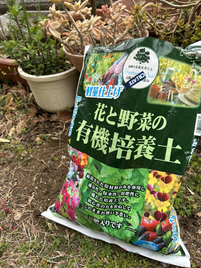 土はいつも『花と野菜の有機培養土』を使います