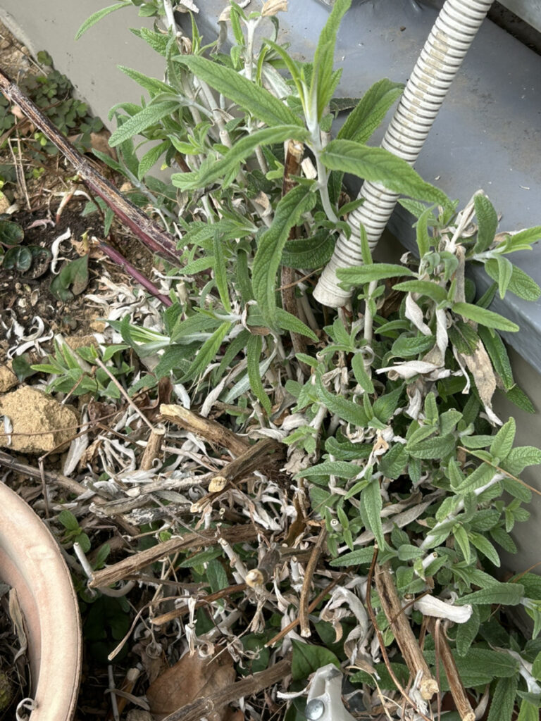 この前降った雪にやられてしまったベルベットセージ…