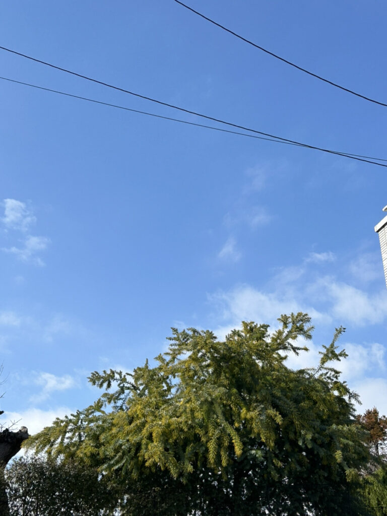 見上げた空は青くミモザの枝にも